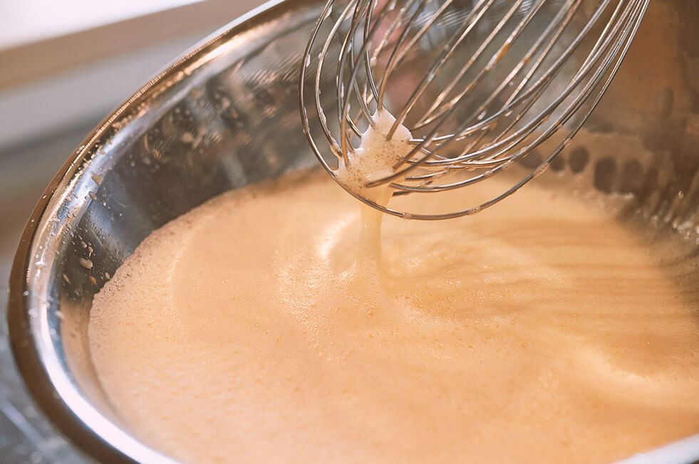 - しっかり空気を混ぜ込み、ツノが立つくらいの固さに仕上げることで、軽やかな食感の衣になります。約15分ほどで内部の気泡が潰れてしまうため、何度も作り直しながら料理をご提供しています。